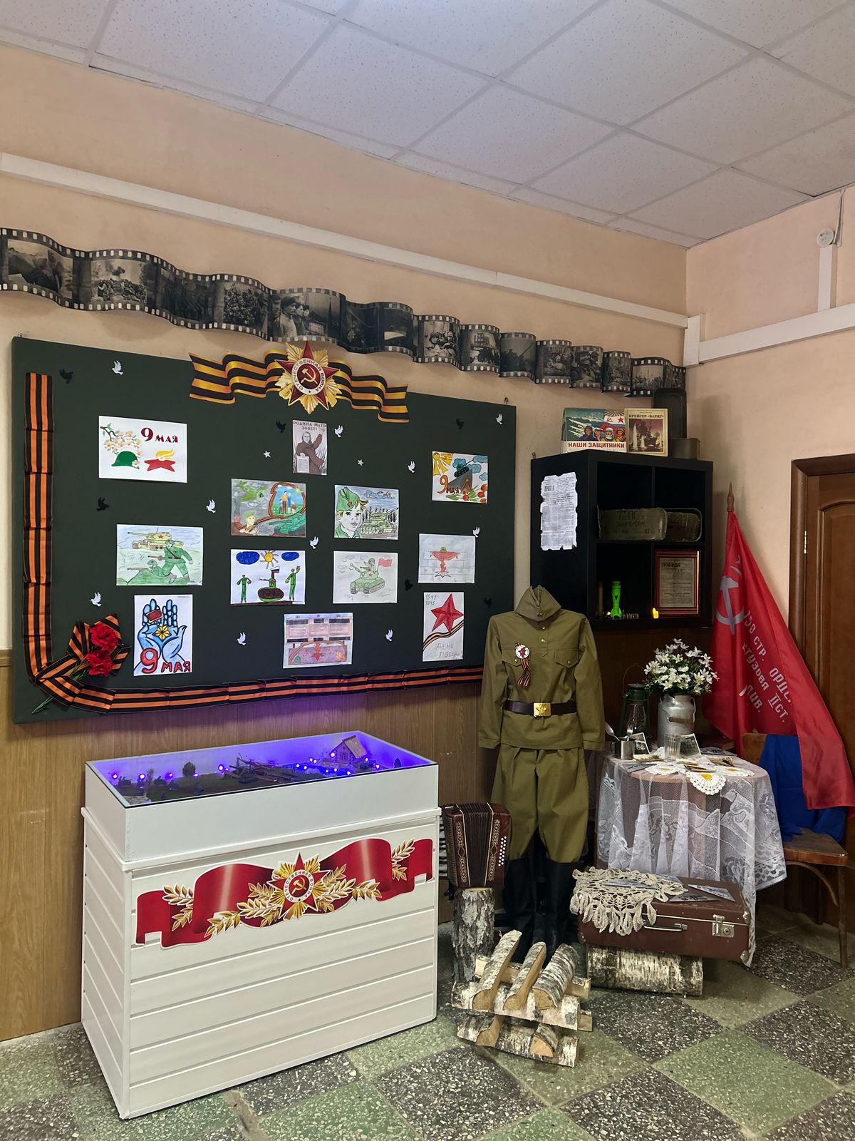 Торжественное открытие экспозиции состоялось 07.04.2025. На выставке представлена реконструкция сражения, созданная руками сотрудников суда, тематически оформленный стенд, который украшает георгиевская лента, голуби мира и рисунки детей сотрудников суда, посвященные подвигам предков. Здесь же можно рассмотреть знаменитый плакат «Родина-мать зовет!», образец газеты «Правда», где опубликовано сообщение Молотова о вероломном нападении фашистской Германии на Советский Союз, а также образец Указа Президиума Верховного Совета СССР «Об объявлении 9 мая праздником Победы». Особое место в экспозиции занимает реконструкция комнаты сороковых годов, где расположен образец военного обмундирования советского солдата, чемодан, гармонь, столик с фотоснимками и военными письмами, висящий на стуле синий платочек. Вверху экспозиции расположена имитация кинопленки, отображающей кадры от начала войны по празднования Победы! ![]() |