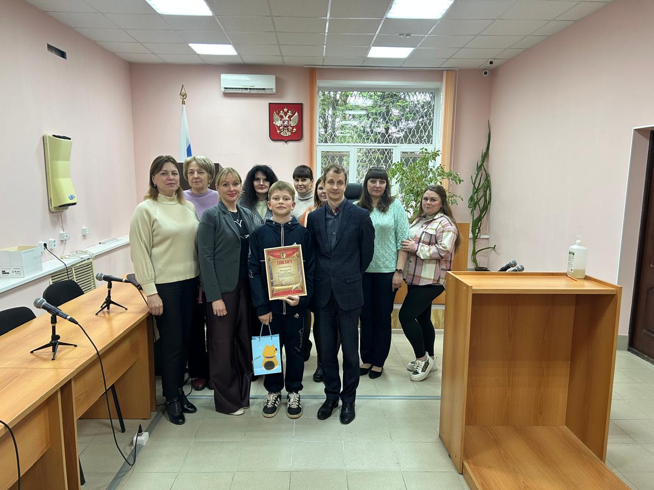 12.05.2025 в торжественной обстановке в здании Краснинского районного суда и.о. председателя суда Е.В. Панковой сыну помощника судьи Ипполитовой Н.Н. Ипполитову Егору вручен диплом Совета судей Смоленской области за участие в творческом конкурсе чтецов «Поэзия Великой Победы», посвященном 80-летию со Дня Победы в Великой Отечественной войне 1941-1945 гг., в возрастной группе от 7 до 10 лет. На конкурсе Егор прочитал пронзительное стихотворение Степана Кадашникова, посвященное Великой Отечественной войне 1941-1945 гг. «Ветер войны». Елена Валерьевна поблагодарила Егора за участие в конкурсе, пожелала ему успехов в учебе, а также вручила памятный подарок. |